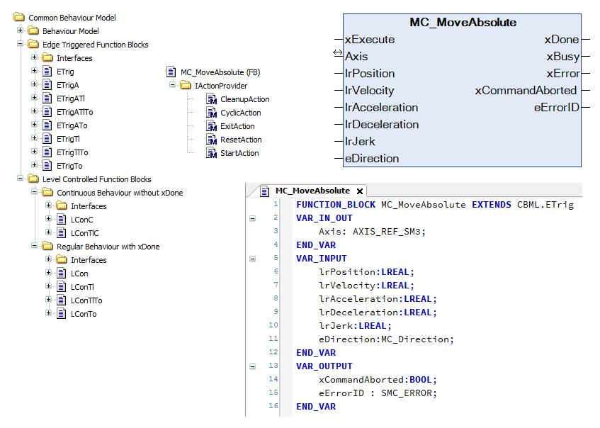Verwendung von Vererbung, um einen neuen Funktionsbaustein MC_MoveAbsolute, der CBML.ETrig erweitert, zu erstellen.