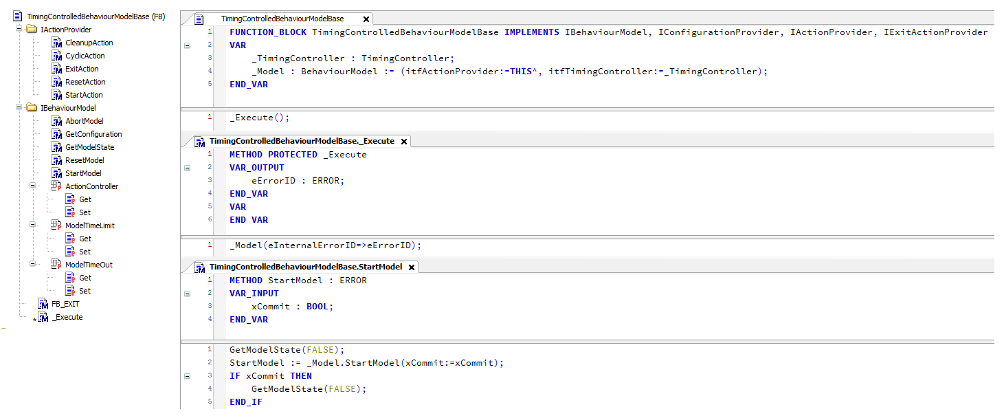 Der Basis-Funktionsbaustein für alle zeitgesteuerten Funktionsbausteine ((TimingControlledBehaviourModelBase) kann unter Anwendung der Komposition erstellt werden. Hierfür werden die Funktionsbausteine BehaviourModel und TimingController eingebunden. Die Eingangsvariablen itfActionProvider und itfTimigController werden korrekt initialisiert. Zusätzlich wird ein Satz von Schnittstellen implementiert. Jeder Aufruf einer Methode und jeder Zugriff auf ein Property muss der lokalen BehaviourModel Instanz delegiert werden.