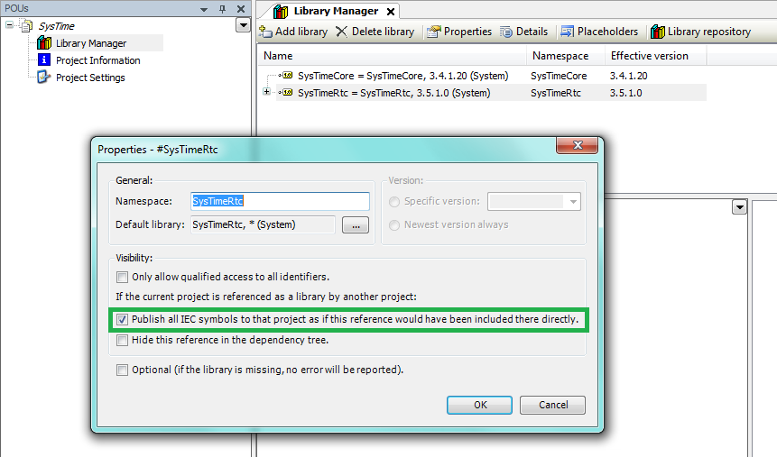 SysTask.library) contains only a library manager with two library (Placeholder) references. And these libraies publish their symbols into the name-space of the container library.The property
